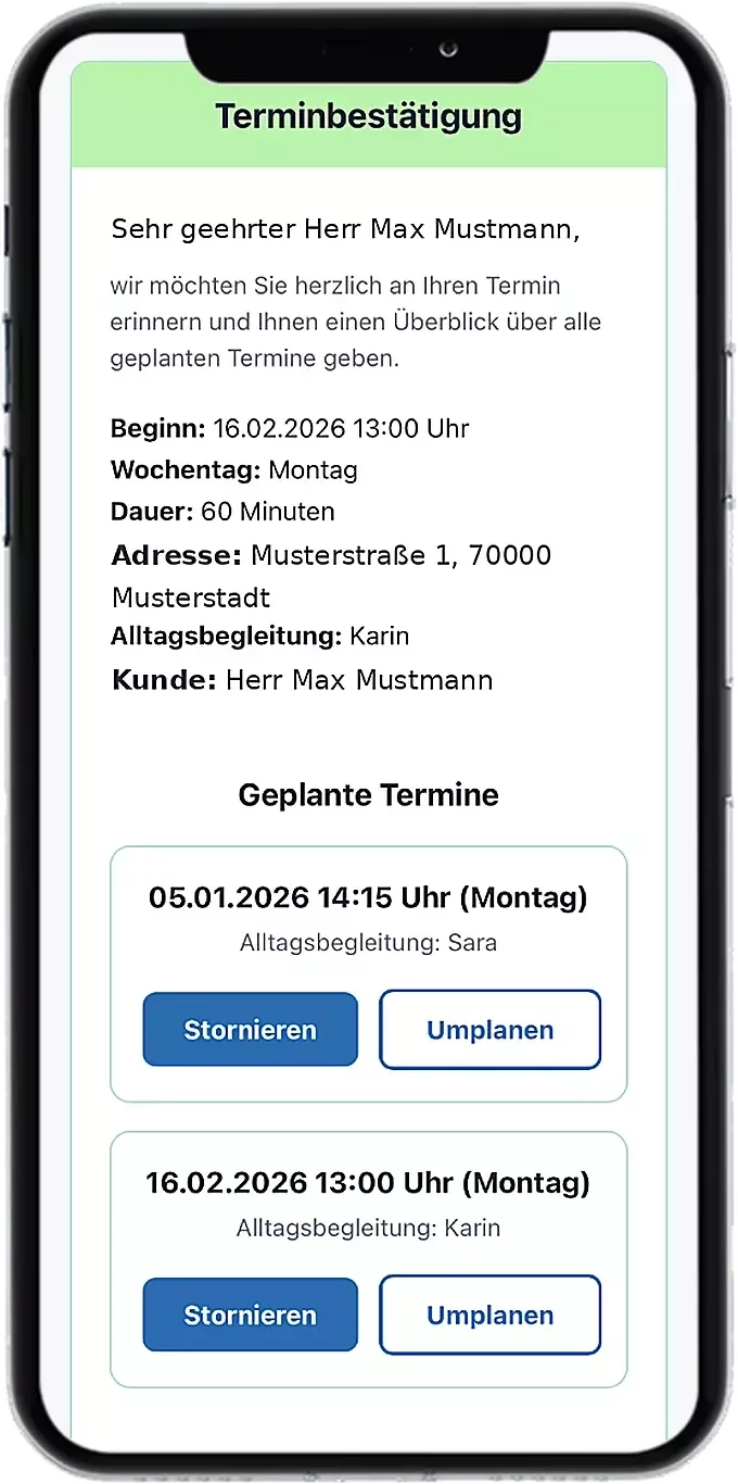 Das spart Zeit, reduziert Abstimmungen und gibt Ihnen – und Ihren Angehörigen – Planungssicherheit.